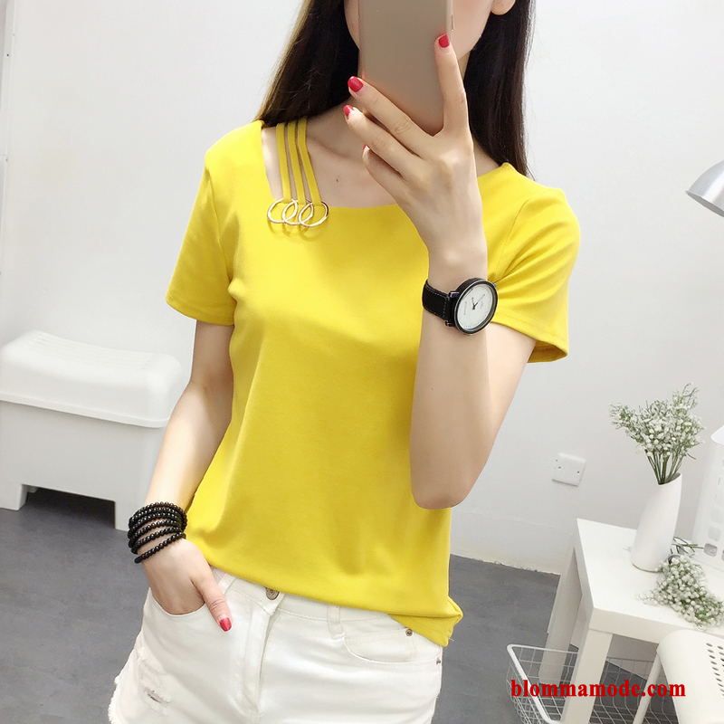 Enkel Vit Gul T-shirt Sommar Slim Fit Tunn Dam